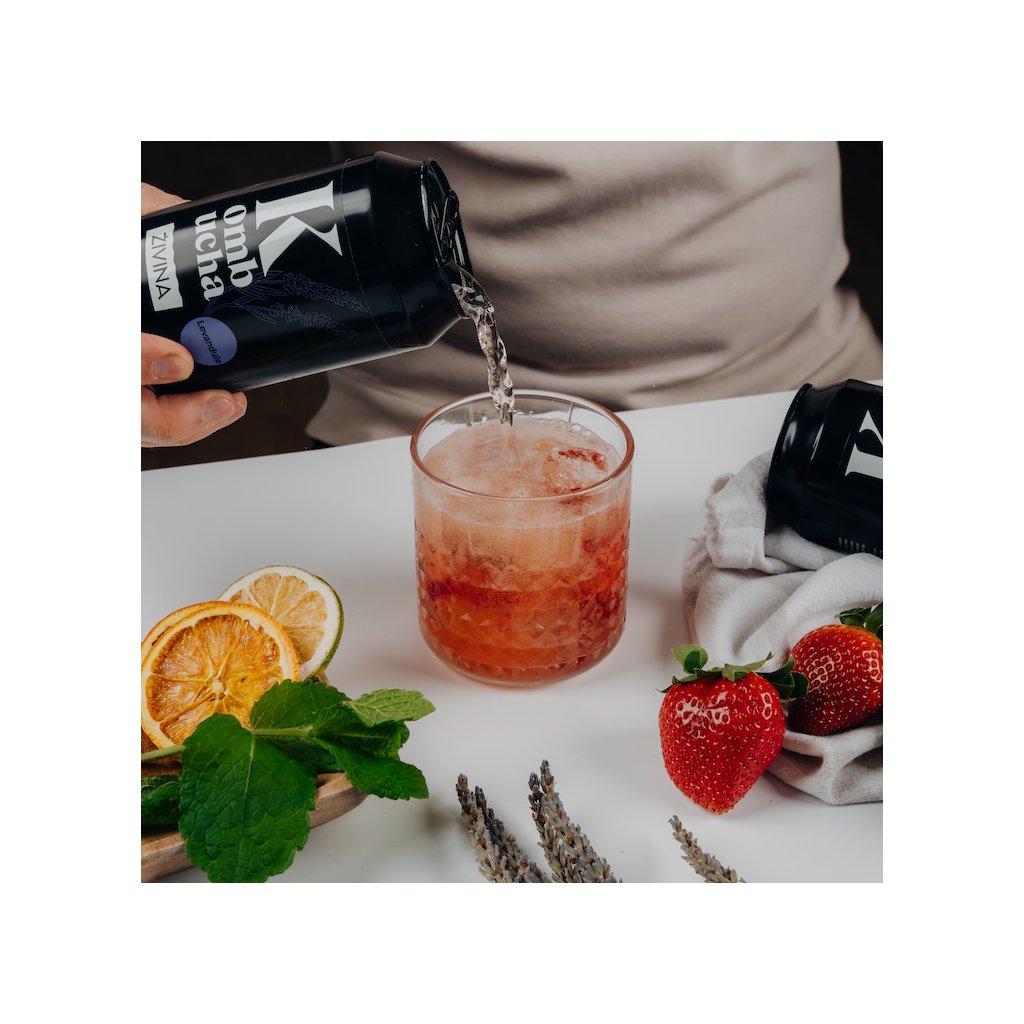 Nápoj je nepasterovaný, a proto zůstává přirozeně živý. Díky tomu si uchovává aktivní kultury kvasinek, bakterií octového kvašení a veškeré látky včetně polyfenolů z čaje. Zachovává si tak nejen svou jemnou chuť, ale i všechny své přirozené vlastnosti vzniklé během kvašení. Základem naší kombuchy jsou pečlivě vybrané suroviny a silný čajový výluh – používáme vyšší množství čaje i bylin, než je běžné. Každý čaj je volen cíleně tak, aby v kombinaci s konkrétní bylinou nebo ingrediencí vytvářel novou, přirozeně harmonickou chuť. Čaj vybíráme vždy s ohledem na výsledný chuťový profil konkrétní kombuchy, aby v kombinaci s dalšími surovinami přirozeně vynikl její charakter a chuťová hloubka. Díky tomu má každá varianta svou vlastní charakteristiku a hloubku. Přidaný cukr slouží primárně jako výživa pro fermentační kultury. Obsah cukru je jen tolik, kolik potřebují fermentační kultury – ne víc.