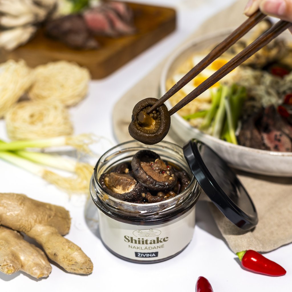 Naše Shiitake nakládané spojují tradiční asijskou recepturu s moderním přístupem k evropským chuťovým preferencím. Sušené shiitake houby marinujeme ve vyvážené směsi fermentované sójové omáčky, třtinového cukru, octa a voňavého koření. Díky šetrné pasteraci houby neztrácí své aroma ani svou masitou texturu a na rozdíl od běžných nakládaných hub netvoří typický šlem.